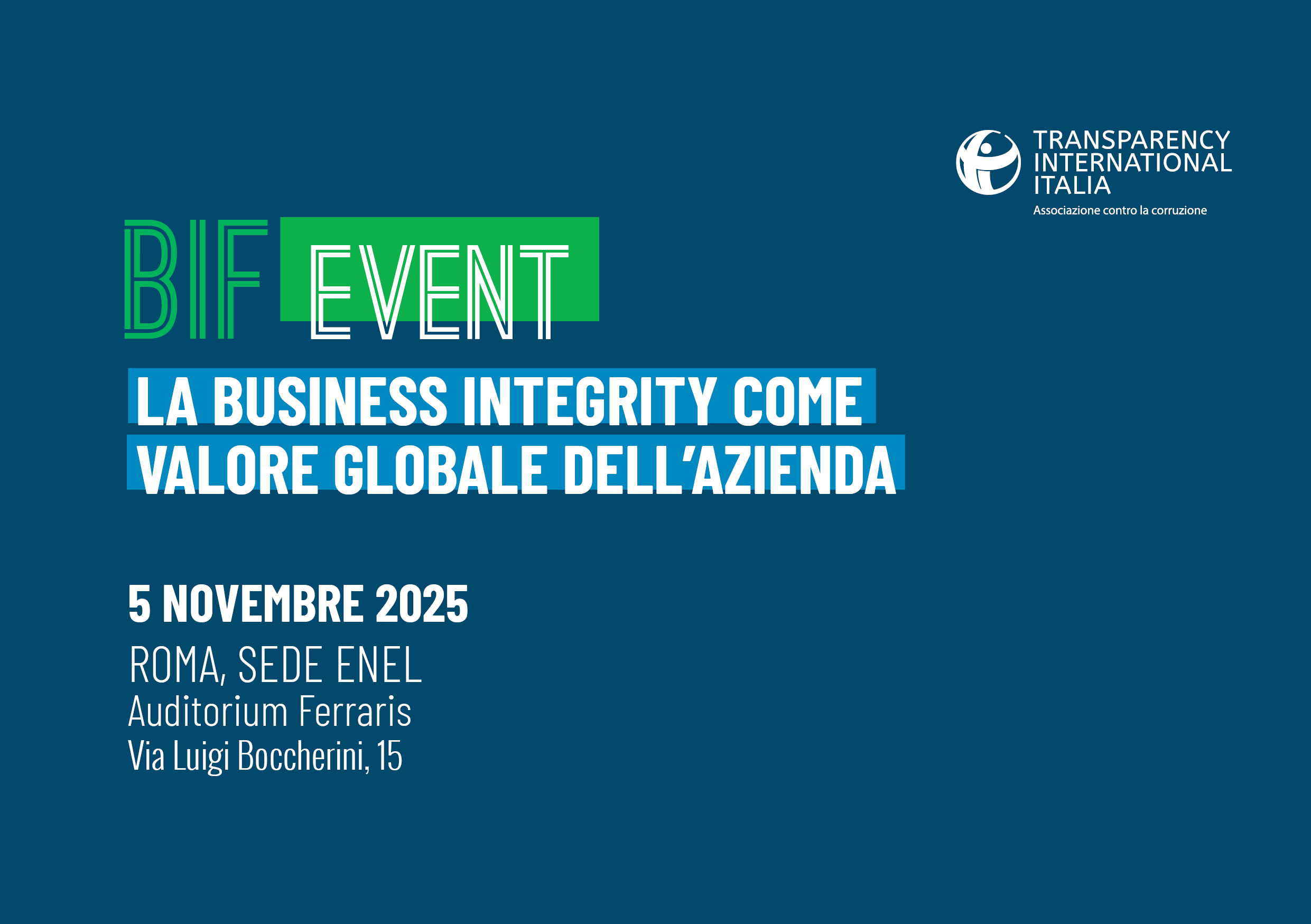 Il 5 novembre a Roma, dalle ore 14.00 alle 16.00, presso l'Auditorium Ferraris delle sede ENEL, si è tenuto un BIF Event straordinario. In occasione del decennale del Business Integrity Forum, abbiamo riunito le aziende aderenti per un nuovo momento di dialogo dedicato a esplorare l’evoluzione della Business Integrity come valore globale dell’impresa.