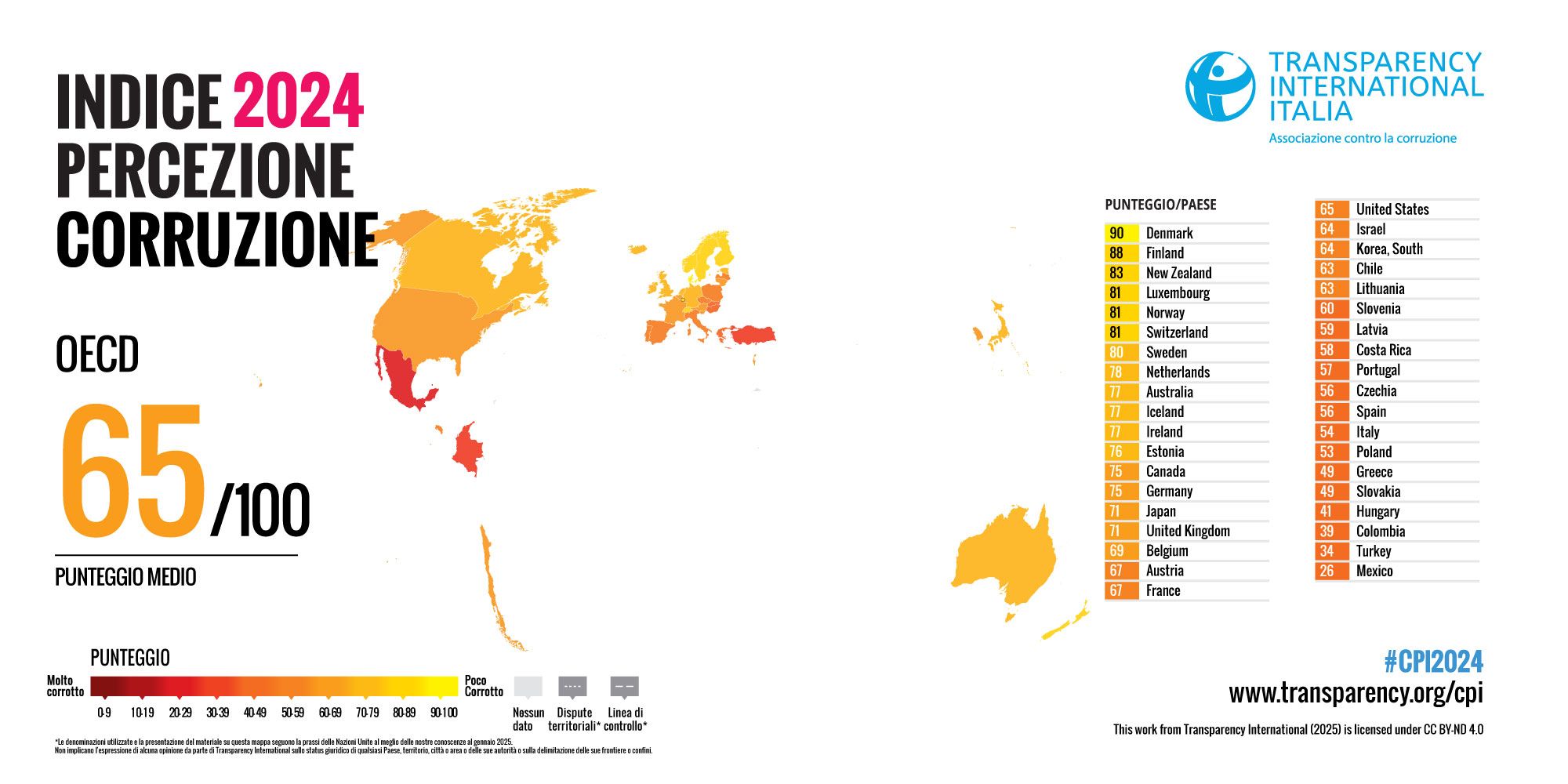 Il punteggio dell’Italia nel CPI 2024 è di 54 e colloca il Paese al 52° posto nella classifica globale ed al 19° posto tra i 27 Paesi membri dell’Unione Europea.