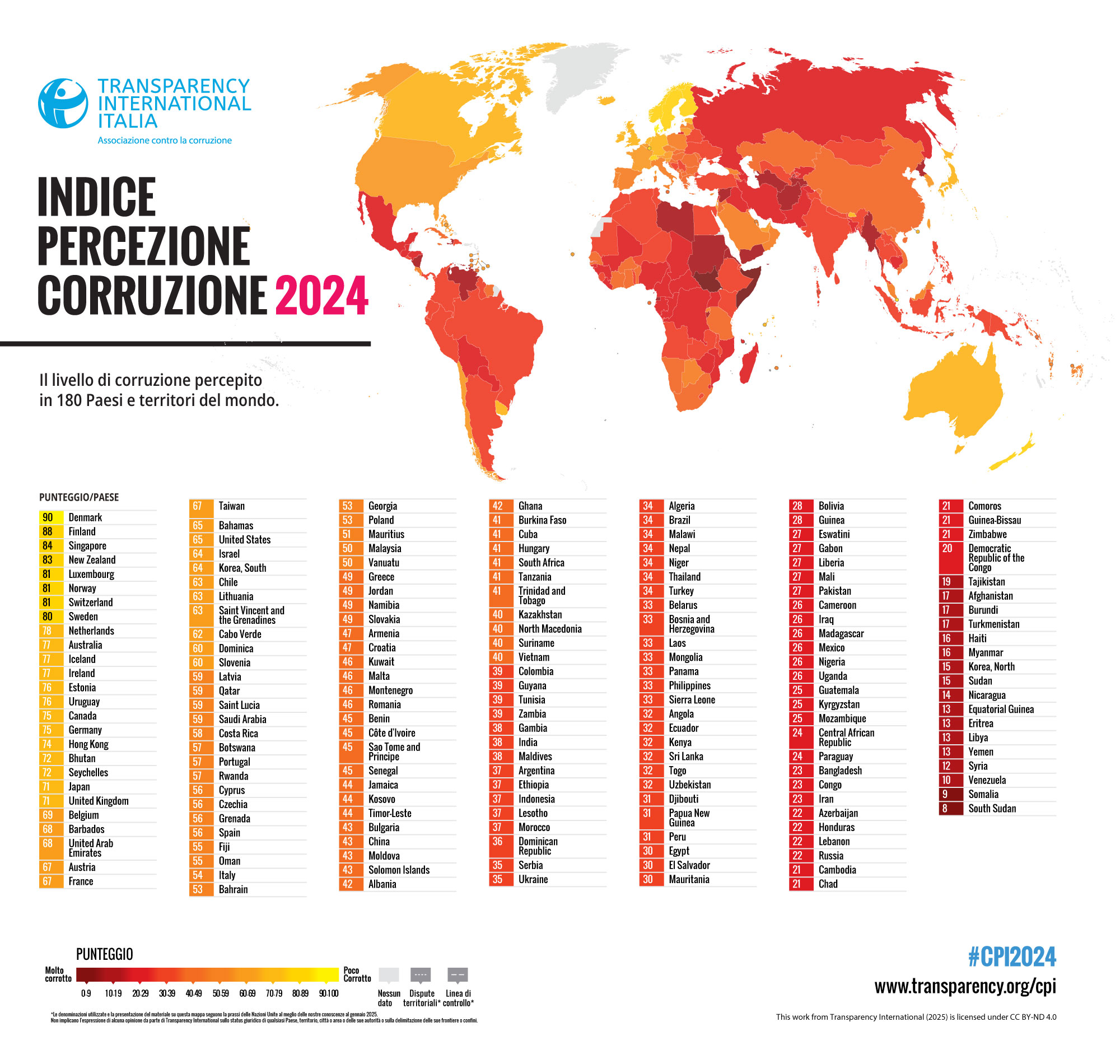 L’Indice di Percezione della Corruzione, elaborato annualmente da Transparency International, nasce nel 1995 ed è diventato il principale indicatore globale della corruzione nel settore pubblico. L'Indice assegna un punteggio a 180 Paesi e territori di tutto il mondo in base alla percezione della corruzione nel settore pubblico, utilizzando dati provenienti da 13 fonti esterne. Il punteggio finale è determinato in base ad una scala che va da 0 (alto livello di corruzione percepita) a 100 (basso livello di corruzione percepita).