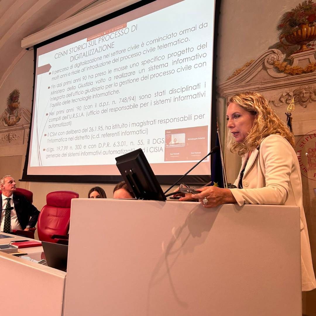 Un’immagine, illustrata da Eleonora Polidori, presidente della sezione civile del Tribunale di Pisa, ha colpito per l’estrema efficacia. "Fino a pochi anni fa - ha spiegato il magistrato, tra i fautori del progetto Giustizia Agile – il mio ufficio era letteralmente invaso da migliaia di fascicoli, tutti cartacei, tutti sostanzialmente fini a sè stessi, nel senso che, non essendo raccolti in un data base, non potevano dare origine ad alcuna statistica e perdevano la loro stessa ragione di esistere con il passare del tempo. Oggi, il mio ufficio è completamente sgombro e ogni procedimento ha sede in un cloud a cui posso accedere in qualsiasi momento, ovunque possa disporre di una connessione, da cui posso ottenere qualsiasi atto facente pare del processo, nessuno escluso".