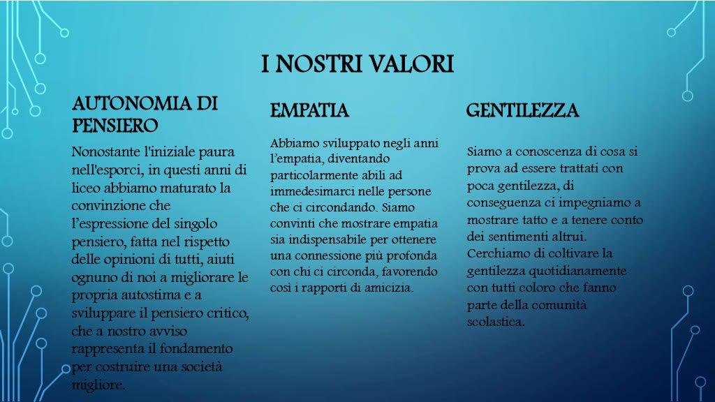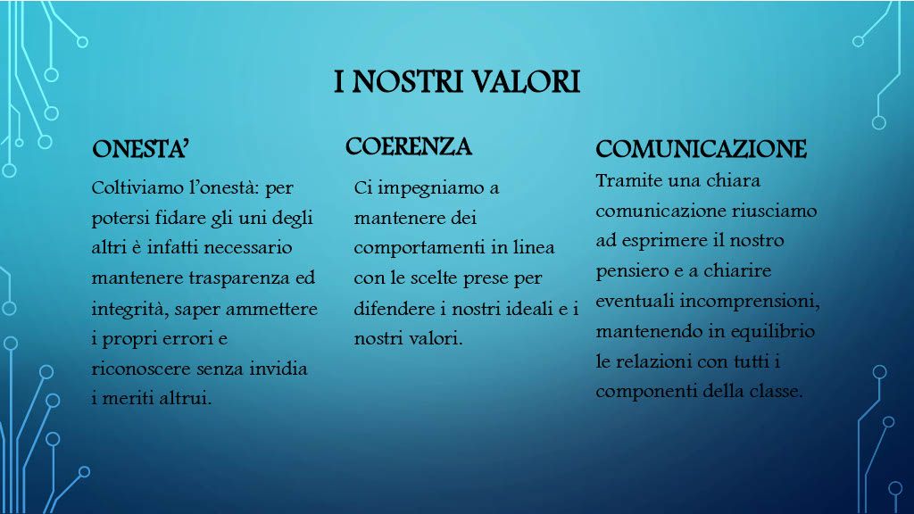Il nostro Codice Etico è stato redatto con la collaborazione attiva di tutta la classe: abbiamo preso spunto dai documenti e dagli interessanti strumenti fornitici nel primo incontro di “Semina” del progetto CI CONVIENE e, in un momento successivo, abbiamo individuato quei valori che, secondo noi, costituiscono l’ossatura e la peculiarità della nostra classe. Dalla nostra conversazione sono venuti fuori molti di valori e, necessariamente, abbiamo dovuto fare una selezione.