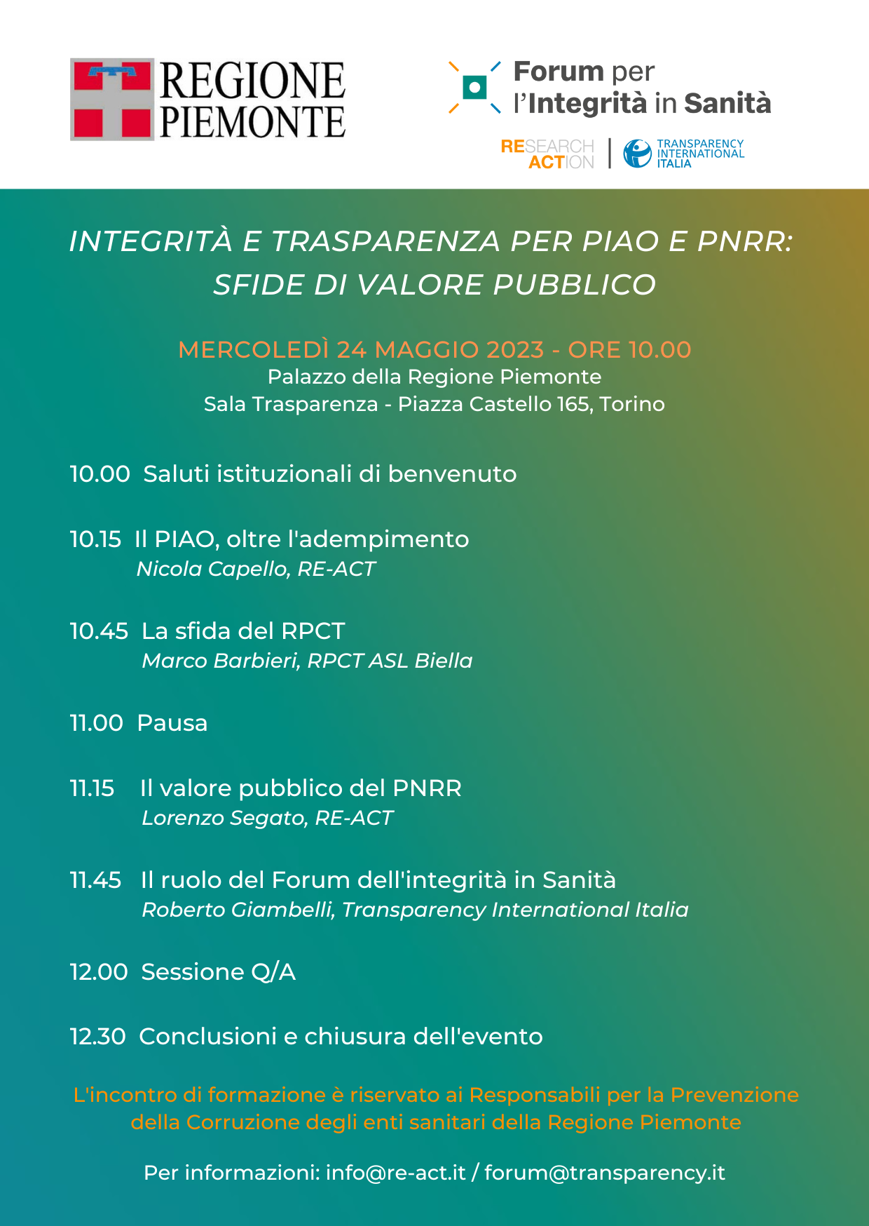 Con il contributo della ASL di Biella si parte dalla Regione Piemonte, il prossimo 24 maggio a Torino, con un incontro diretto ad aprire un dialogo con i responsabili anticorruzione degli enti sanitari e delle aziende della Regione Piemonte, per far conoscere il Forum e le sue attività.