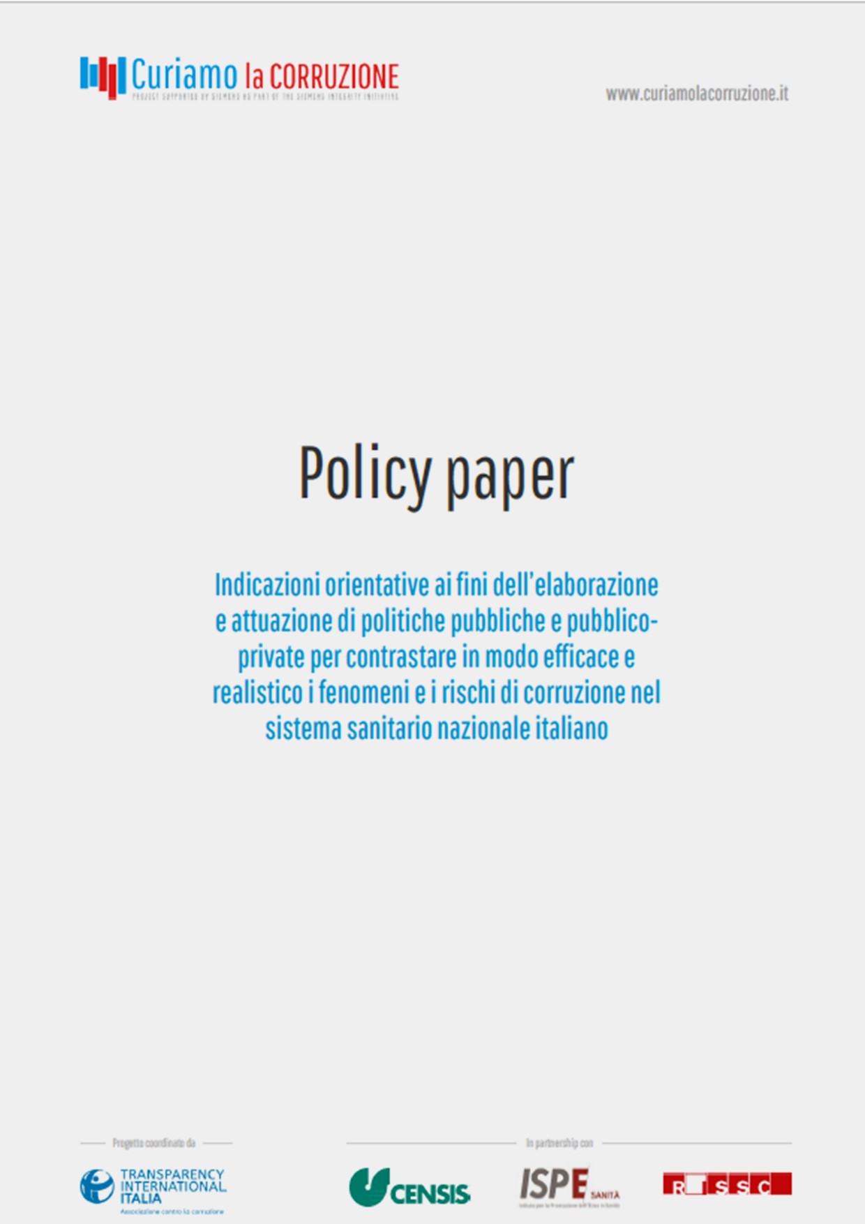 Questo Policy Paper è stato elaborato nell'ambito dei lavori del Tavolo Pubblico Privato del progetto Curiamo la corruzione e ha lo scopo di analizzare la questione per identificare possibili soluzioni. L'obiettivo del documento è responsabilizzare gli attori preposti a gestire e a interagire con il sistema sanitario nazionale rispetto alla risoluzione dei problemi di corruzione che sono già presenti o che rischiano di ingenerarsi.