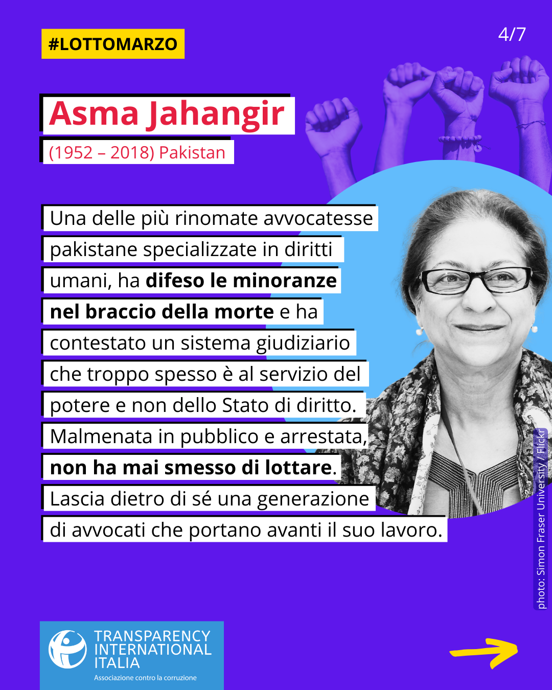 Una delle più rinomate avvocatesse pakistane specializzate in diritti umani, ha difeso le minoranze nel braccio della morte e ha contestato un sistema giudiziario che troppo spesso è al servizio del potere e non dello Stato di diritto. Malmenata in pubblico e arrestata, non ha mai smesso di lottare. Lascia dietro di sé una generazione di avvocati che portano avanti il suo lavoro.