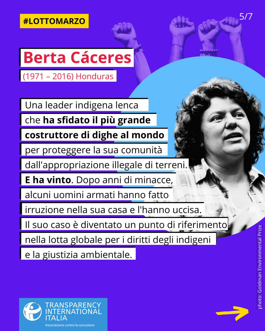 Una leader indigena lenca che ha sfidato il più grande costruttore di dighe al mondo per proteggere la sua comunità dall'appropriazione illegale di terreni. E ha vinto. Dopo anni di minacce, alcuni uomini armati hanno fatto irruzione nella sua casa e l'hanno uccisa. Il suo caso è diventato un punto di riferimento nella lotta globale per i diritti degli indigeni e la giustizia ambientale.