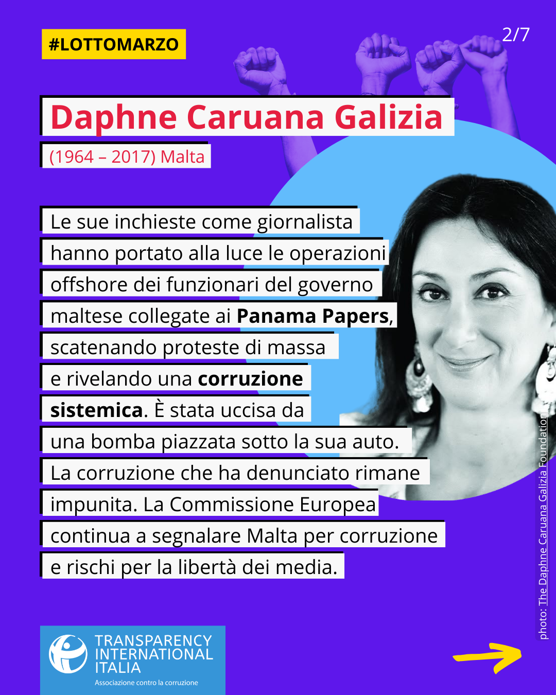 Le sue inchieste come giornalista hanno portato alla luce le operazioni offshore dei funzionari del governo maltese collegate ai Panama Papers, scatenando proteste di massa e rivelando una corruzione sistemica. È stata uccisa da una bomba piazzata sotto la sua auto. La corruzione che ha denunciato rimane impunita. La Commissione Europea continua a segnalare Malta per corruzione e rischi per la libertà dei media.