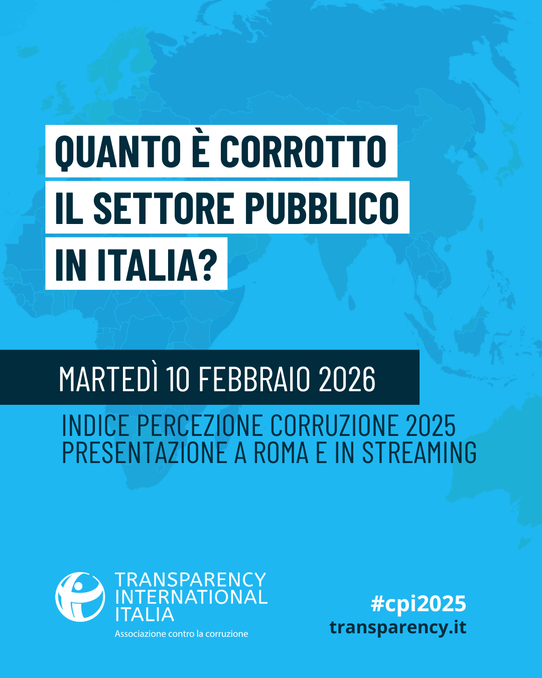 Il 10 febbraio 2026 a Roma, nella Galleria del Primaticcio in Piazza di Firenze 27, presenteremo l'edizione 2025 dell'Indice di Percezione della Corruzione di Transparency International. L'evento è promosso da Transparency International Italia con il patrocinio della Fondazione IFEL.