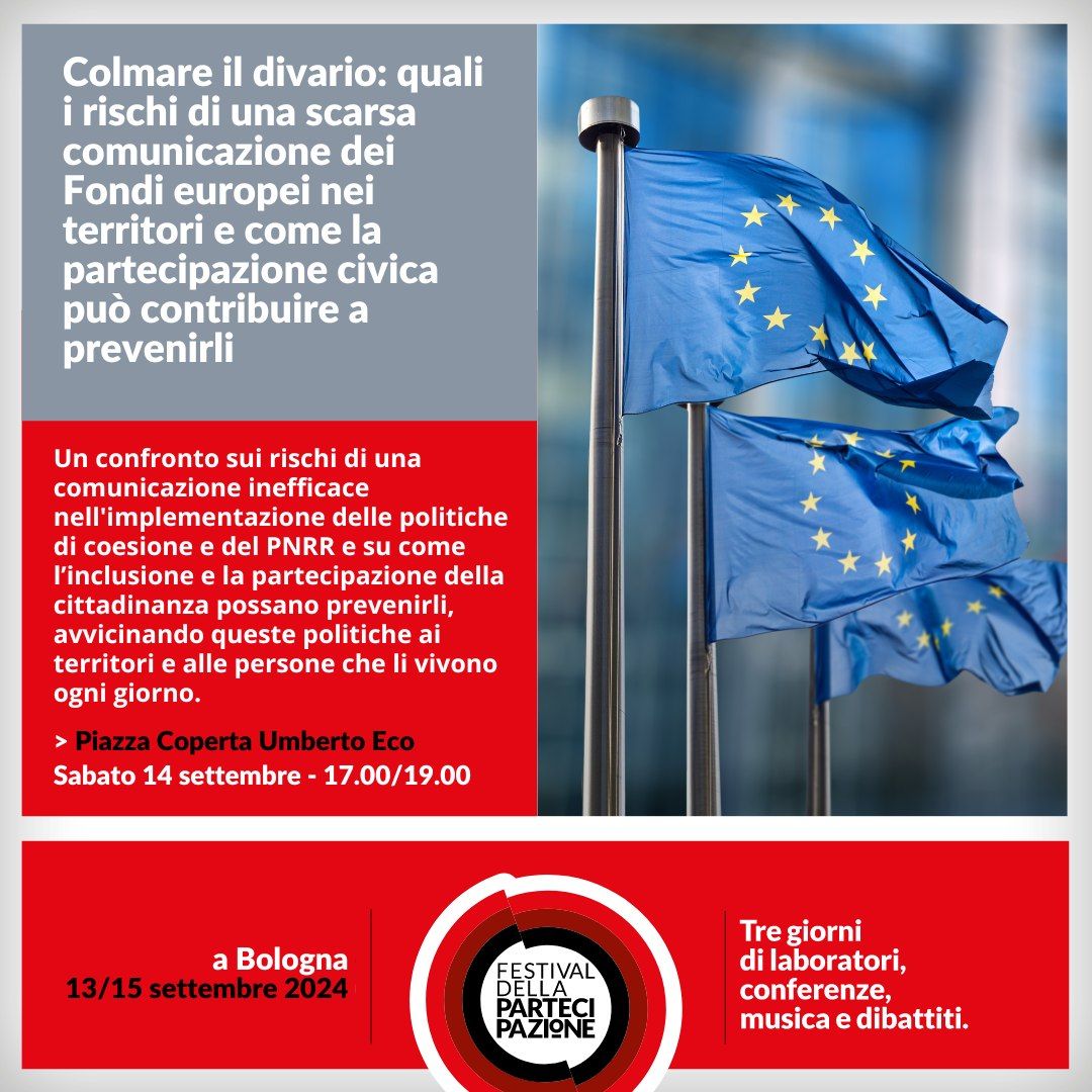 A seguire, partendo dal lavoro svolto nel workshop, si svolgerà l'evento pubblico Colmare il divario: quali i rischi di una scarsa comunicazione dei Fondi europei nei territori e come la partecipazione civica può contribuire a prevenirli, che vedrà un confronto tra stakeholders chiave della comunicazione delle politiche europee sui rischi di una comunicazione inefficace nell’implementazione delle politiche di coesione e del PNRR e su come l’inclusione e la partecipazione della cittadinanza possano prevenirli, avvicinando tali politiche ai territori e alle persone che li vivono ogni giorno.