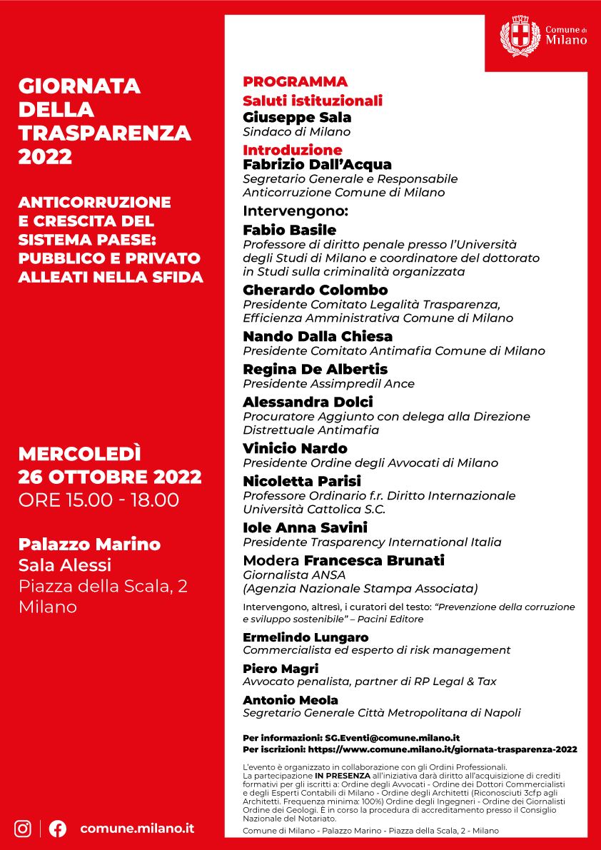 Mercoledì 26 ottobre parteciperemo alla Giornata della Trasparenza 2022 organizzata dalla Segreteria generale del Comune di Milano presso Palazzo Marino, per promuovere e sensibilizzare cittadini, cittadine e ordini professionali sul tema sempre più attuale della trasparenza nella Pubblica Amministrazione.