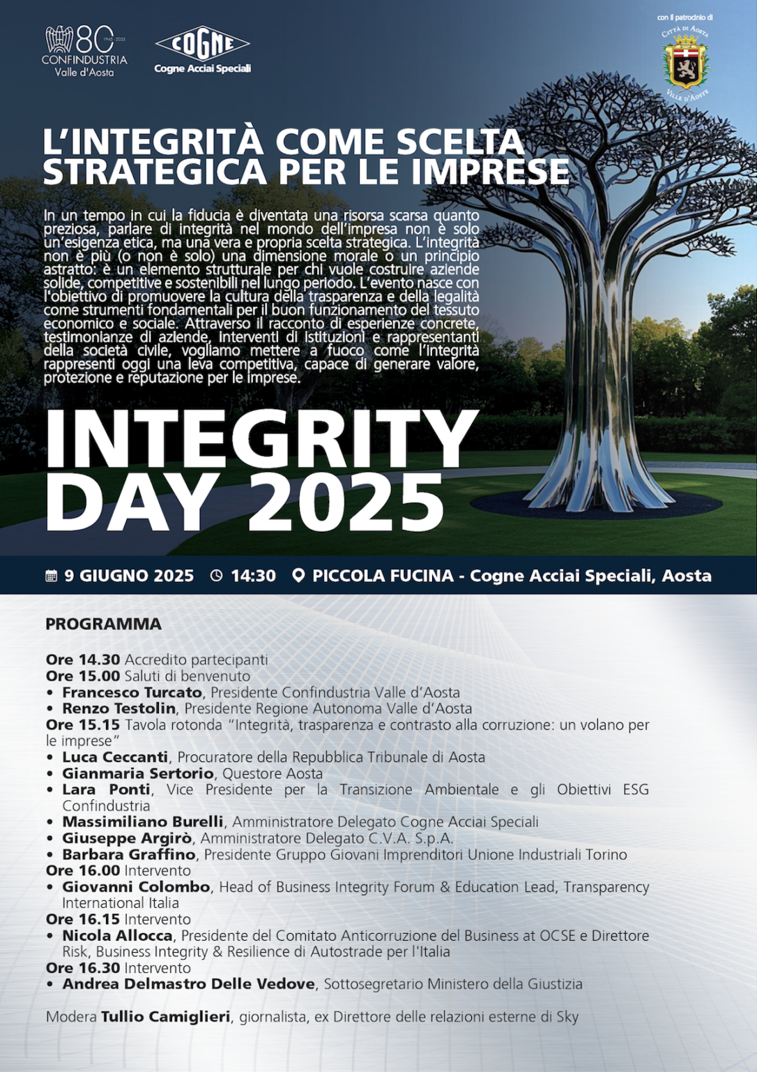 Lunedì 9 giugno ad Aosta parteciperemo ad un evento dedicato al tema dell’integrità e della trasparenza nel sistema economico e produttivo, promosso da Cogne Acciai Speciali S.p.A. e Confindustria Valle d'Aosta.