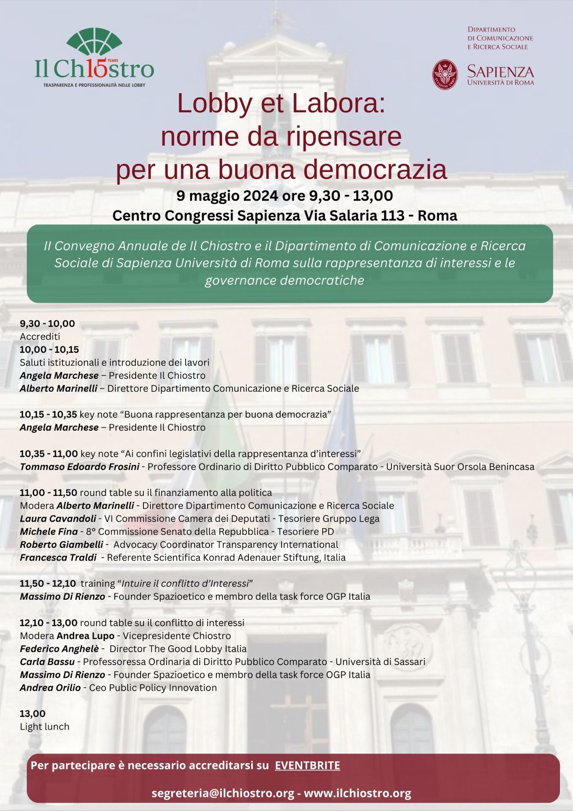 Giovedì 9 maggio a Roma, presso il Centro Congressi dell'Università Sapienza, si terrà il convegno Lobby et Labora: norme da ripensare per una buona democrazia. Si tratta del convegno annuale sulla rappresentanza di interessi e le governance democratiche dell'Associazione IlChiostro e del Dipartimento di Comunicazione e Ricerca Sociale dell'Università Sapienza (Coris).