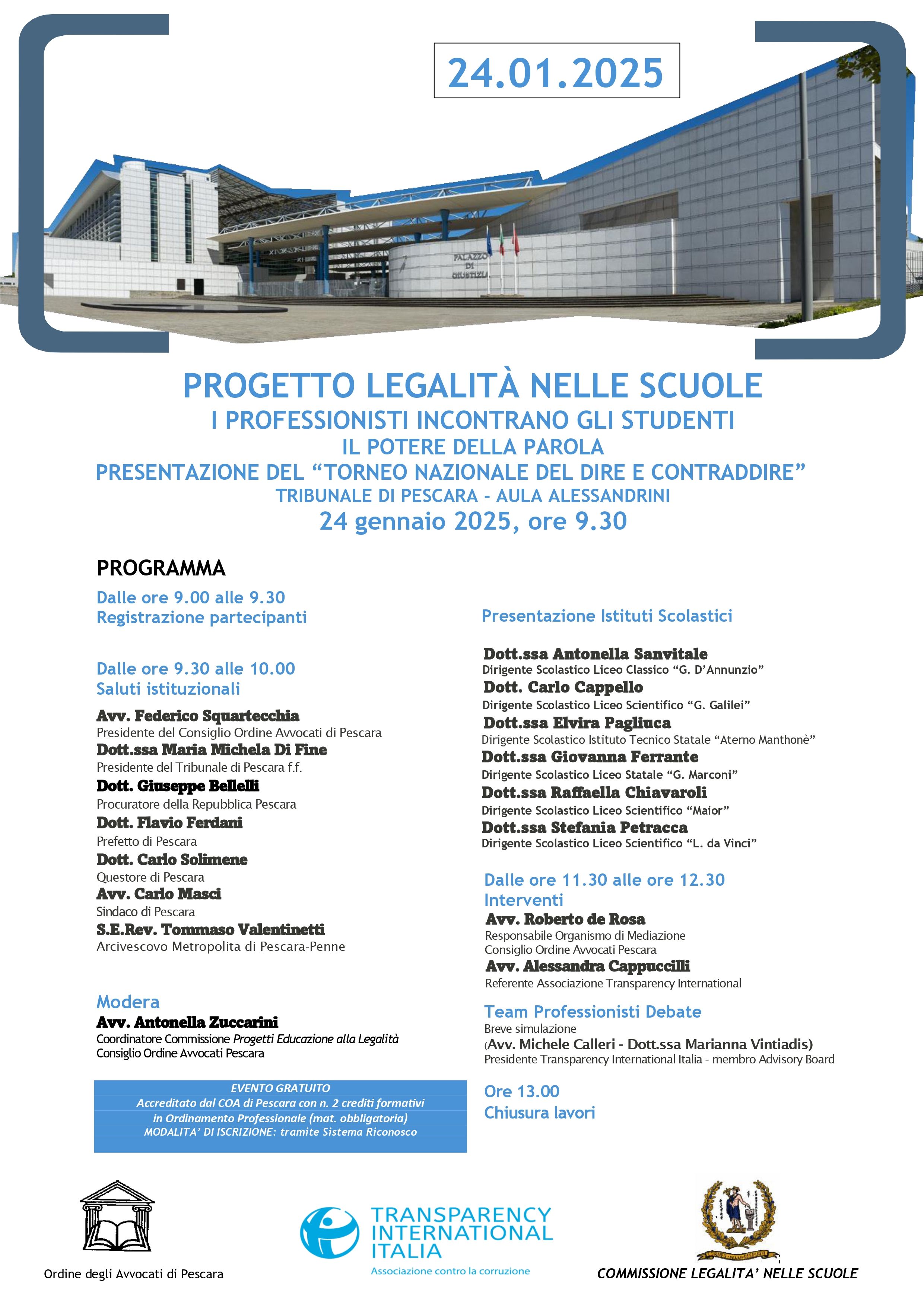 Venerdì 24 gennaio 2025 a Pescara, dalle ore 9.00, nell'Aula Alessandrini del Tribunale di Pescara, con il Consiglio degli avvocati di Pescara e la Commissione legalità nelle scuole, parteciperemo alla presentazione del Torneo nazionale del "Dire e Contraddire".