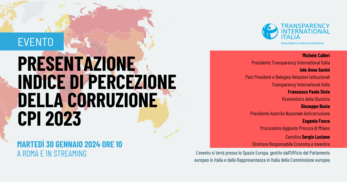 Il 30 gennaio 2024 dalle ore 10 a Roma e in streaming presenteremo l'edizione 2023 dell'Indice di Percezione della Corruzione di Transparency International, una misurazione della percezione della corruzione nel settore pubblico e nella politica.