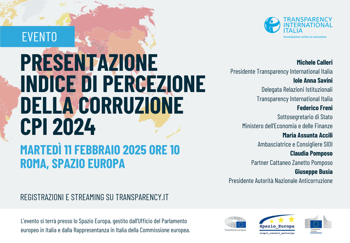 L'11 febbraio 2025, dallo Spazio Europa a Roma, presenteremo l'edizione 2024 dell'Indice di Percezione della Corruzione di Transparency International.