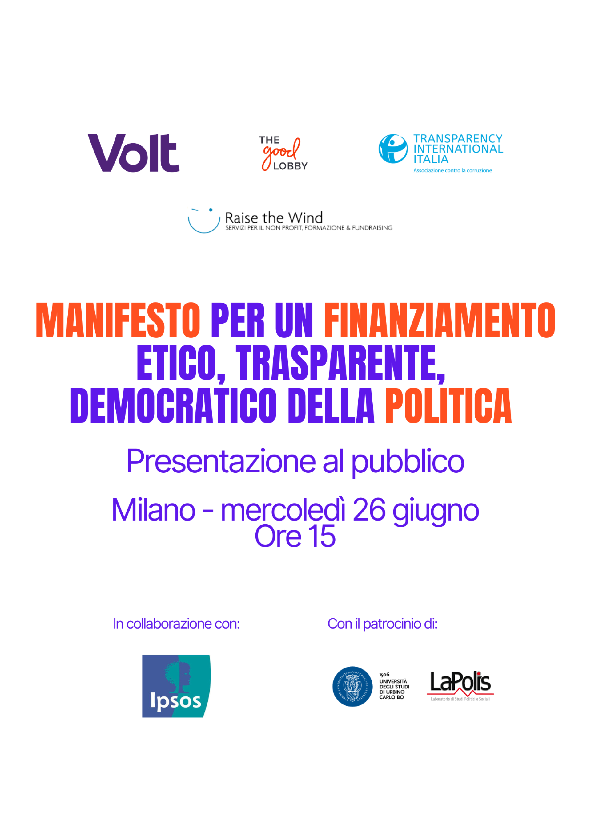 L'evento è promosso da Transparency International Italia, The Good Lobby, Volt e Raise the Wind, in collaborazione con Ipsos Italia e con il patrocinio dell'Università di Urbino Carlo Bo e dell'istituto LaPolis.