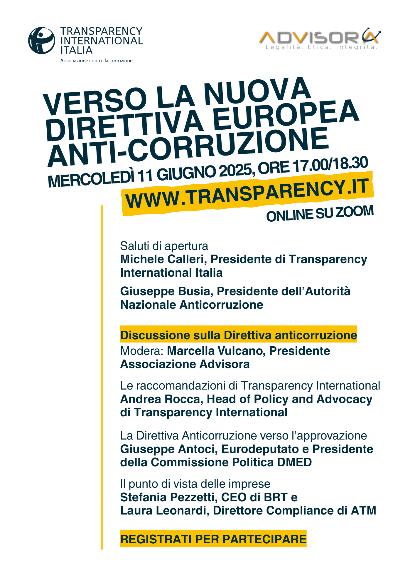 A introdurre e guidare i lavori sono stati Michele Calleri, Presidente di Transparency International Italia, e Marcella Vulcano, Presidente dell'Associazione Advisora. La discussione ha preso avvio dal contributo e saluto di apertura di Giuseppe Busia, Presidente dell'Autorità Nazionale Anticorruzione.