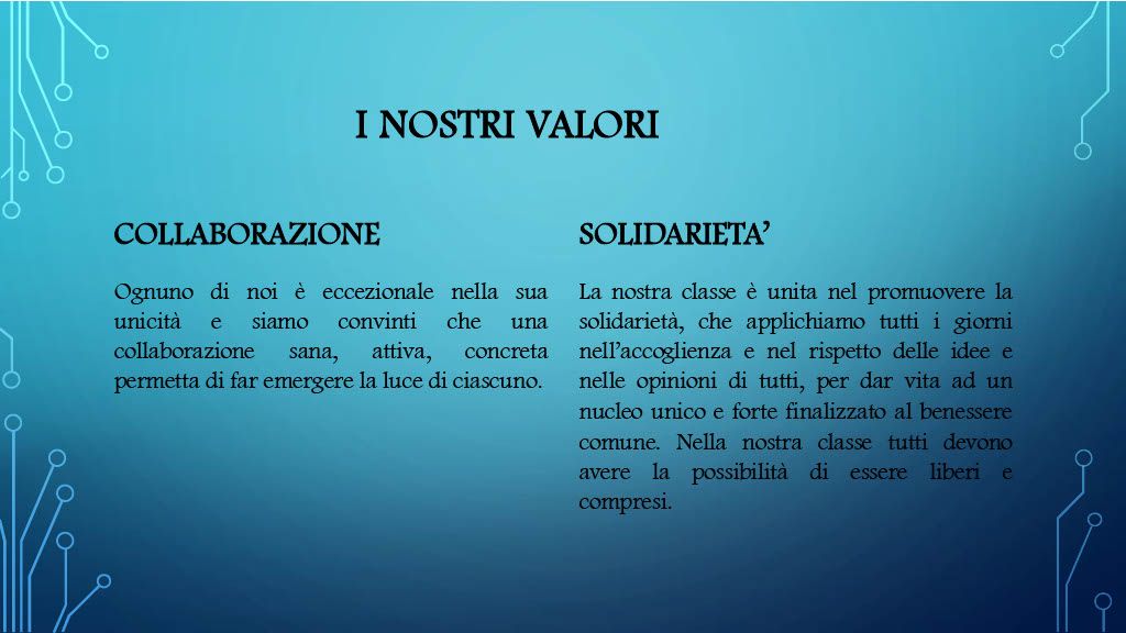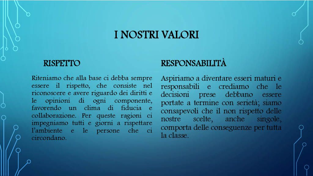 Il nostro Codice Etico è stato redatto con la collaborazione attiva di tutta la classe: abbiamo preso spunto dai documenti e dagli interessanti strumenti fornitici nel primo incontro di “Semina” del progetto CI CONVIENE e, in un momento successivo, abbiamo individuato quei valori che, secondo noi, costituiscono l’ossatura e la peculiarità della nostra classe. Dalla nostra conversazione sono venuti fuori molti di valori e, necessariamente, abbiamo dovuto fare una selezione.