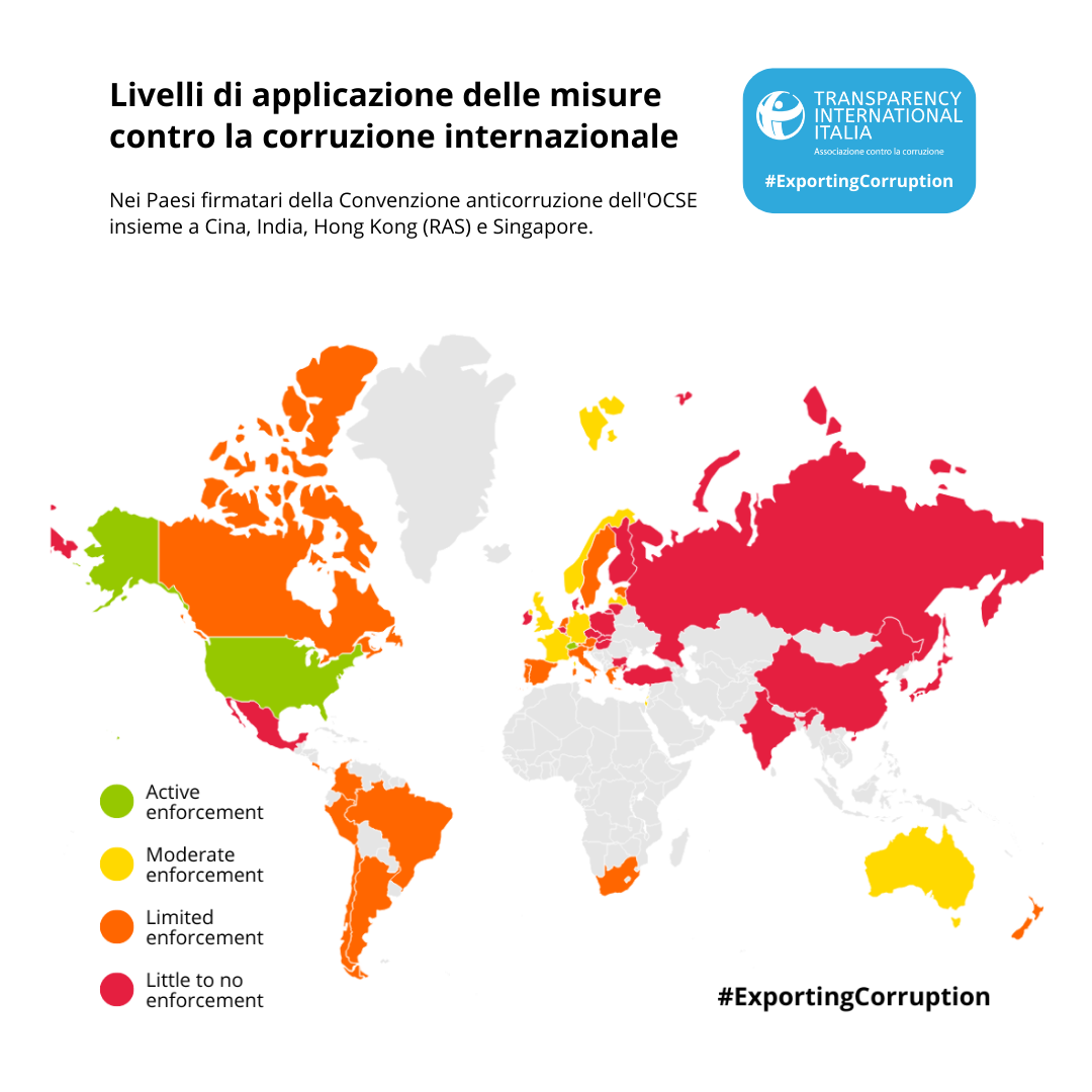 Exporting Corruption 2022 classifica i 47 Paesi dell'analisi in base alla loro quota di esportazioni globali, secondo quattro categorie di efficacia di applicazione della Convenzione: “attiva”, “moderata”, “limitata”, e “poca o nessuna”. Il report rileva che persiste la tendenza al ribasso già osservata negli ultimi anni e che attualmente gli "esecutori attivi" della Convenzione sono solo gli Stati Uniti e la Svizzera - che rappresentano solo l'11,8% delle esportazioni globali.