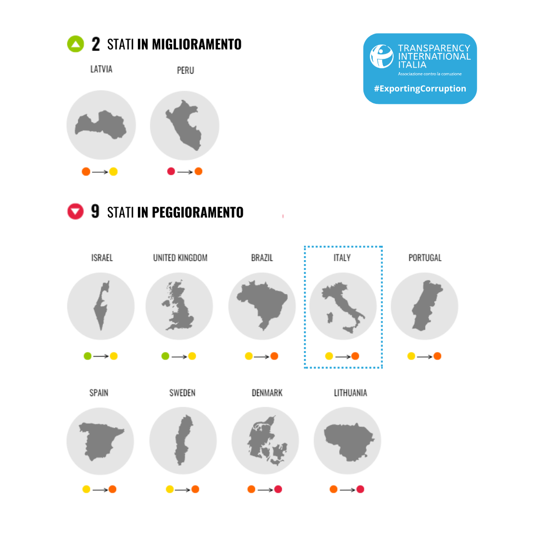 Venticinque anni dopo l’adozione della Convenzione anticorruzione dell'OCSE, la maggior parte dei Paesi sono ancora molto lontani dall’attuazione degli obblighi previsti e il report di Transparency International osserva un declino continuo anche in Stati che prima attuavano attivamente la Convenzione. Sono solo due i Paesi in miglioramento e ben nove quelli in peggioramento: Israele, Regno Unito, Brasile, Italia, Portogallo, Spagna, Svezia, Danimarca e Lituania.