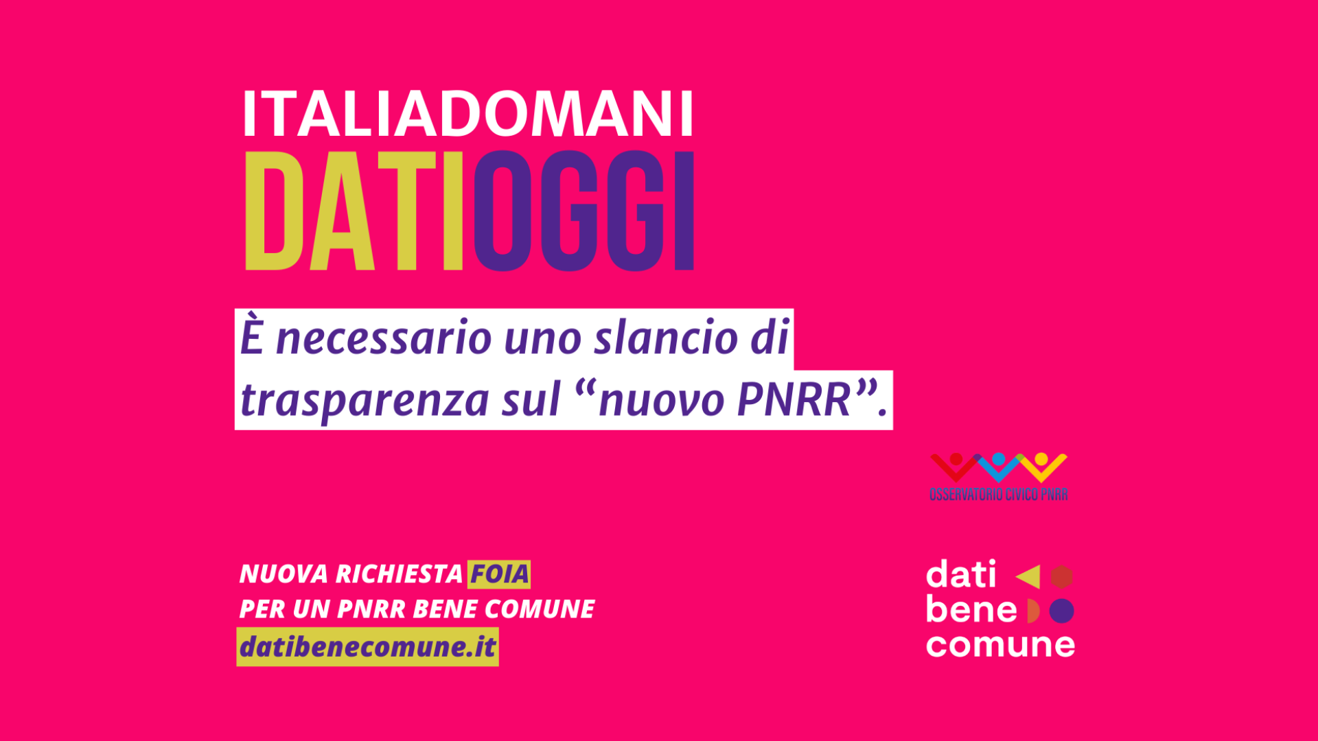 Fin dall’avvio del Piano nazionale di ripresa e resilienza, con le oltre 300 organizzazioni riunite nella campagna “Dati Bene Comune” e con l’Osservatorio civico Pnrr, chiediamo maggiore trasparenza e accesso pubblico alle informazioni.