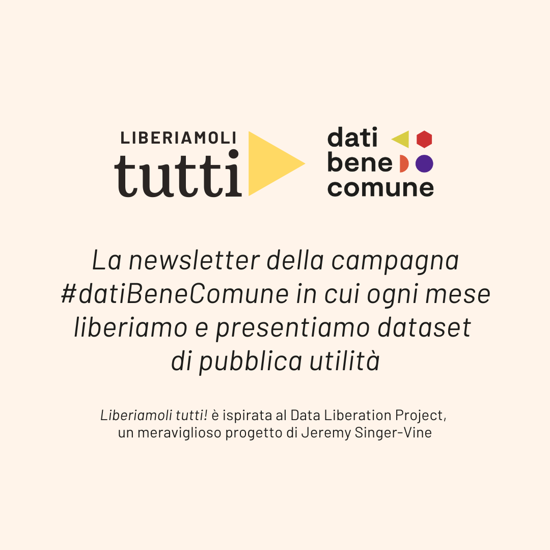 A novembre 2023, con le oltre 300 organizzazioni e i migliaia di cittadini che sostengono la campagna, abbiamo proposto Liberiamoli tutti! - un’azione collettiva della campagna datiBeneComune per individuare, ottenere, riformattare, pulire, documentare, pubblicare e diffondere dati di interesse pubblico. Tanti di questi dati sono inaccessibili alle persone e alle comunità che ne hanno più bisogno: non sono mai stati resi pubblici, sono pubblicati in formati di difficile utilizzo, o senza la documentazione necessaria per interpretarli correttamente.