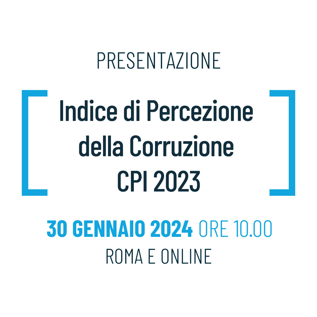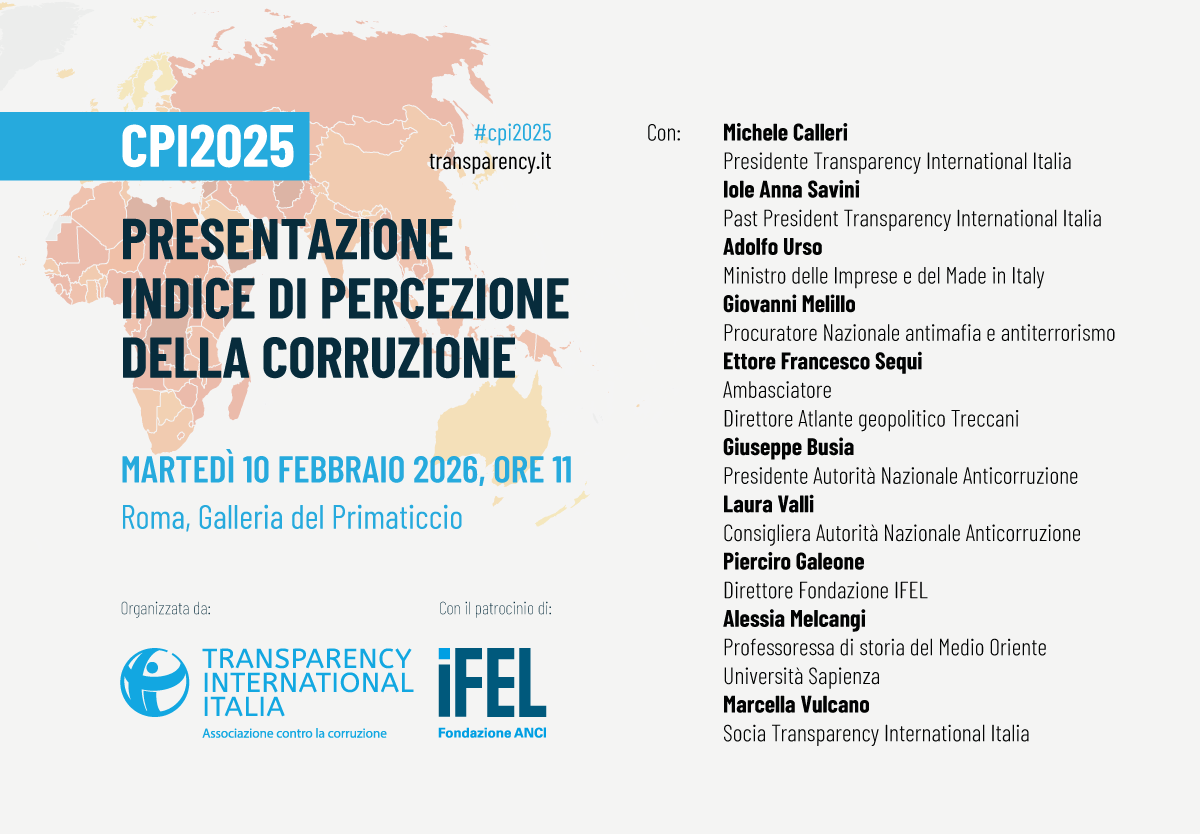 Il 10 febbraio 2026 a Roma, nella Galleria del Primaticcio in Piazza di Firenze 27, presenteremo l'edizione 2025 dell'Indice di Percezione della Corruzione di Transparency International. L'evento è promosso da Transparency International Italia con il patrocinio della Fondazione IFEL.